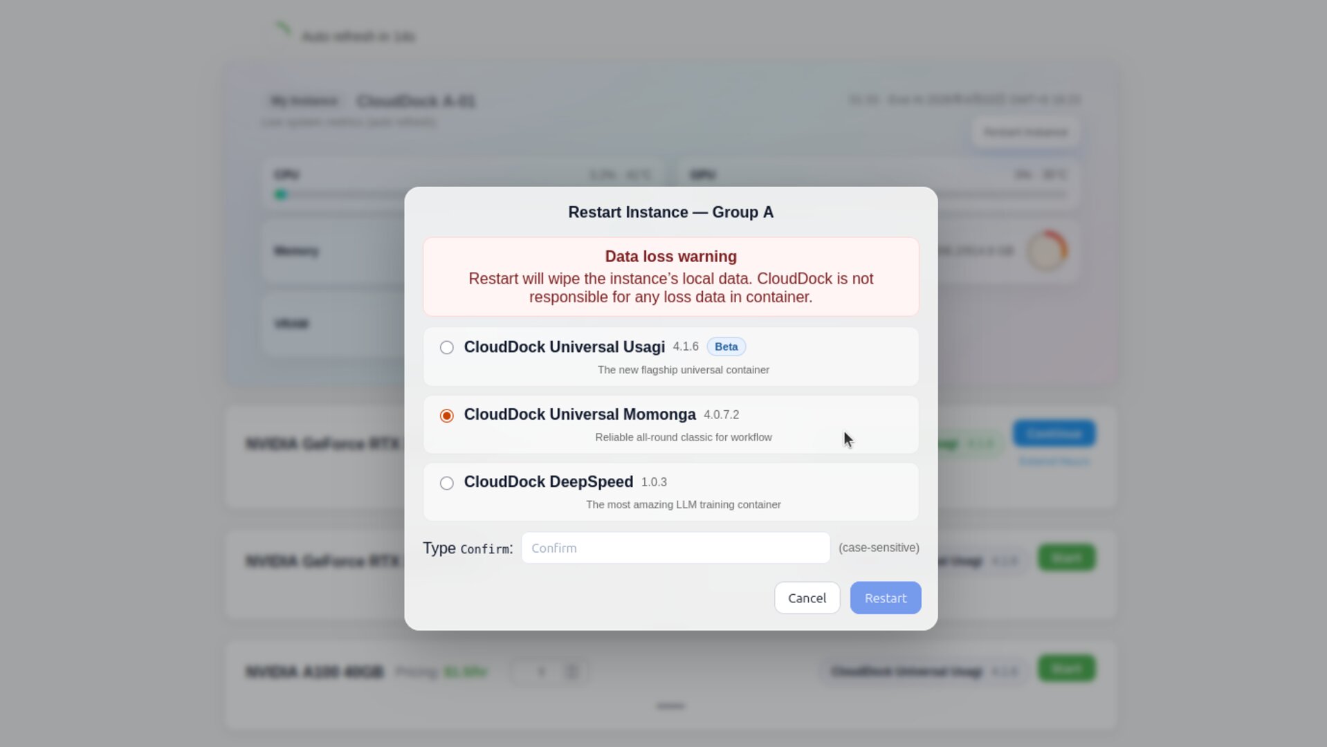 Click Restart Instance to begin the container switch flow.A list of available container images will appear.