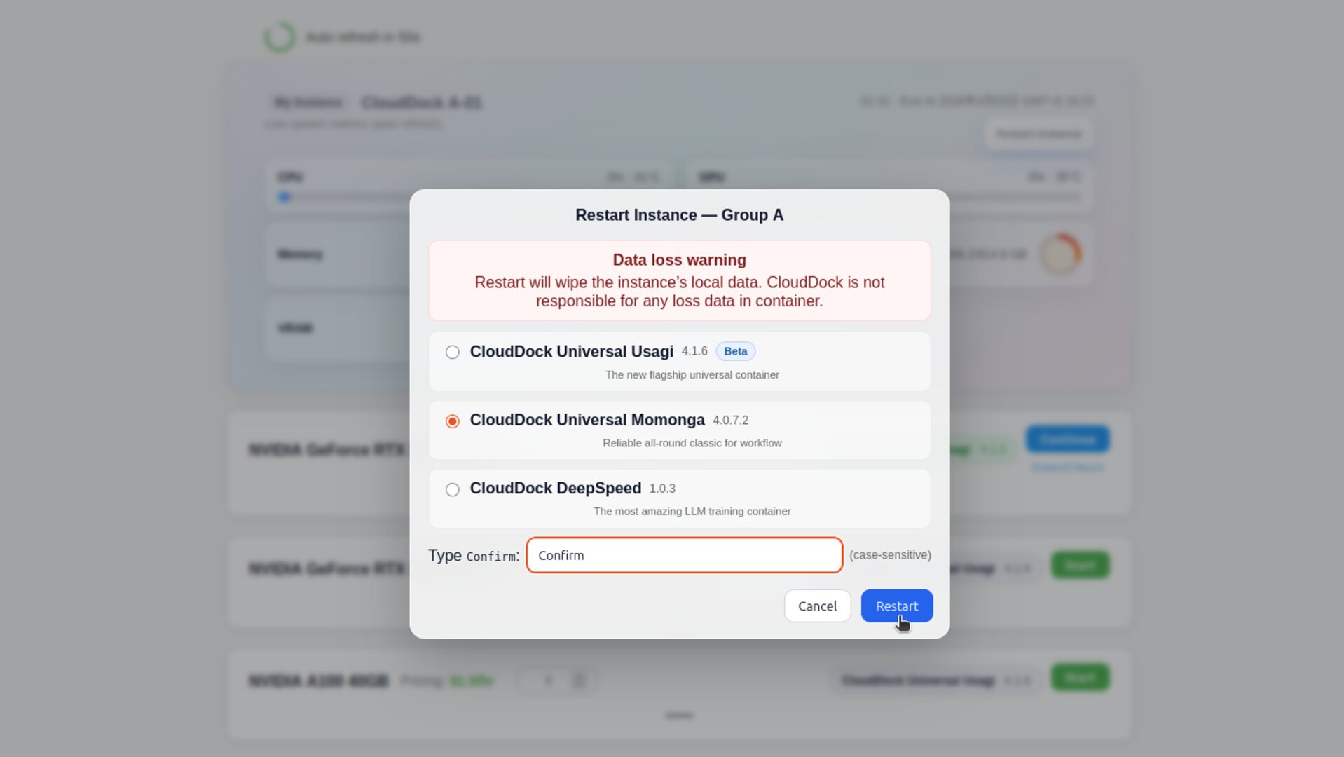 Type Confirm (case-sensitive) in the confirmation box, then click Confirm to proceed.This step prevents accidental restarts.